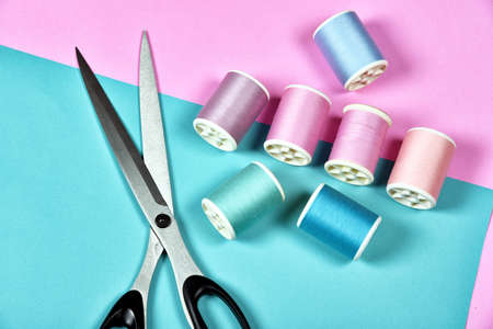 Colored thread spools and sewing accessories on a pink and light blue background in a top view