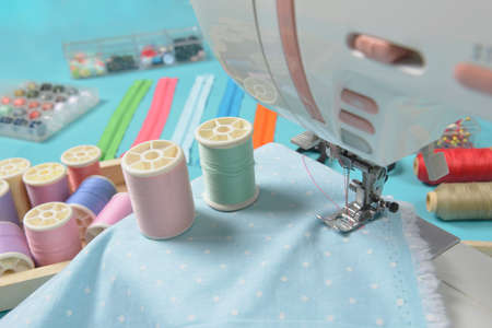 Fabrics on sewing machine amid the scissors, shirt buttons, zipper, pin and colorful thread rolls for sewing on blue background, Sewing and needlework concept.
