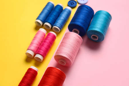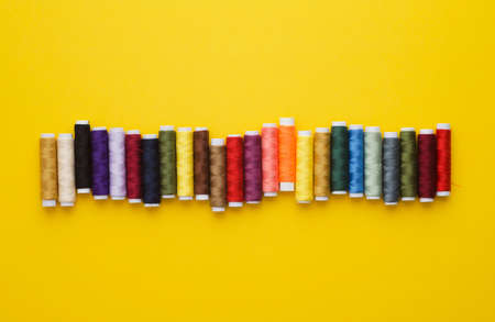 Sewing threads as a multicolored background. High angle view of colored threads for tailor job.