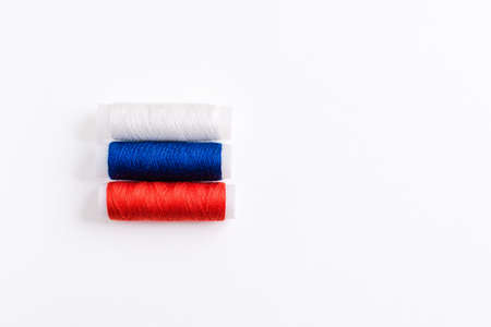 Three spools of thread for sewing are stacked in the form of the flag of Russia on a white background. Concept of Russian patriotism and the country's clothing industry. There is a free empty space.