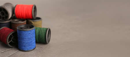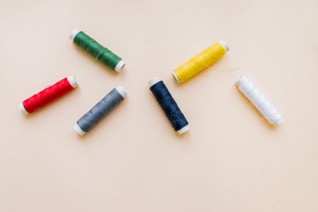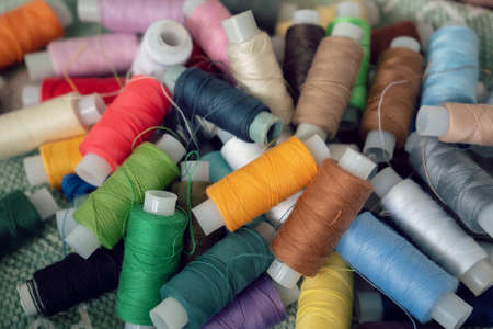 Thread rolls, Group of colorful thread on sewing desk, Craft, sewing and needlework concept.