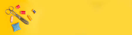 Panoramic view on sewing composition with threads on white background. Long banner, top view, copy space, flat lay, mock up