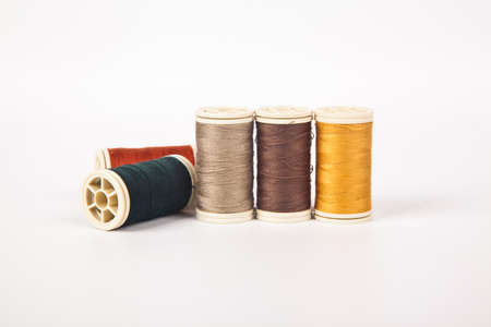 Spools and bobbins of thread for sewing in different colors, isolated on white background