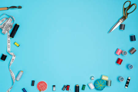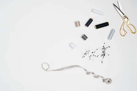 Sewing items from above. Flat lay composition with sewing accessories on light color background. Items for sewing, Sewing clothes, measuring tape, tailoring scissors, threads, buttons and needles