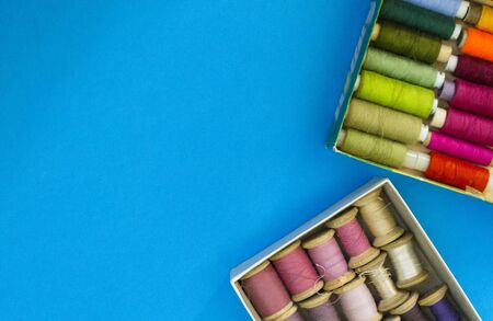 Colorful sewing threads lie in a box in a row gradient on a blue background, selective focus. There is a place for text.