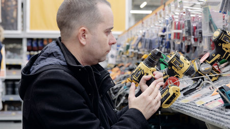 Hardware store customer comparing cordless screwdriver features, evaluating specifications for professional grade tool selection during home improvement project planning