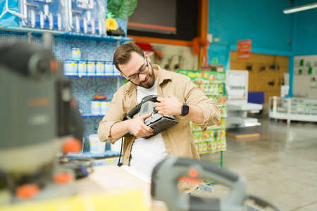 Happy caucasian man smiling while looking at the power tools or polisher at the hardware store while shopping