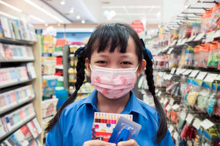 Uniform student girl wear face mask and buying school supplies in stationery store.Back to school concept