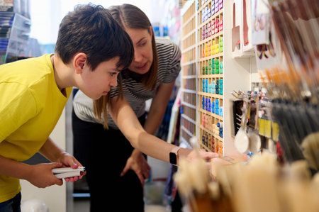 Adorable dark-haired teen schoolboy asking the advice of a sales manager in art shop, choosing felt-tip pens from the shelf with a large assortment of colorful drawing, painting and sketching tools