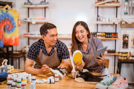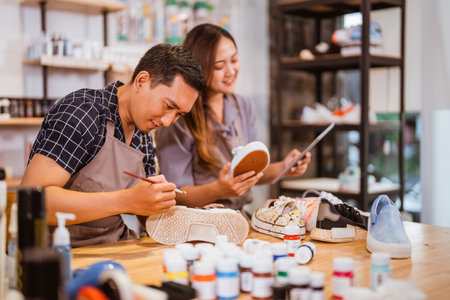 male artist paint on sneakers at his workshop