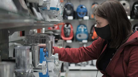 Girl in a protective mask against the virus, chooses an electric meat grinder in the store. The concept of shopping during a pandemic and epidemic