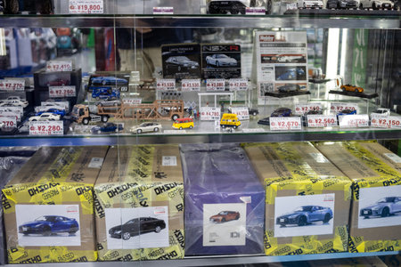 TAIWAN, TAIPEI. DEC 31, 2017: Tourist walking amid Gunpla, Gundam and vehicle (Car, Motorcycle, Truck, Tank, etc.) plastic model kit boxes on the shelf in the retail shop.
