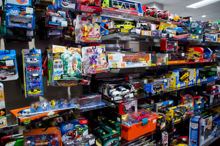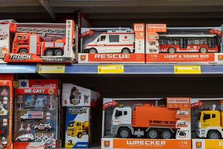 April 22, 2021 Beltsy Moldova goods on the market shelf. Supermarket showcase. Illustrative editorial. Model cars in the childrens toys department