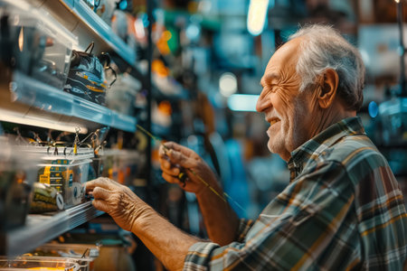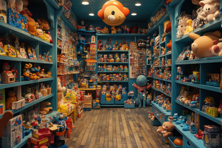 Creative atmosphere of a toy store with a man constructing a set, pleased expression capturing the joy of the vibrant environment