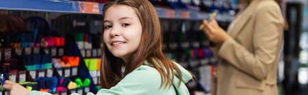 cheerful schoolgirl smiling at camera near rack with colorful stationery and blurred mom, banner