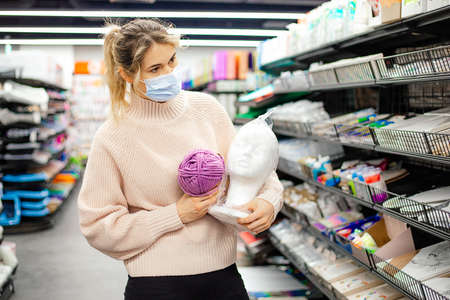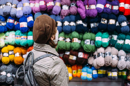 Woman in face mask selects yarn products in a handicraft store. Shopping concept