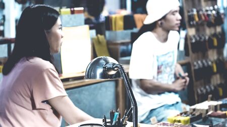 asian young man standing with pointing when choose item with his girlfriend in an accessories store