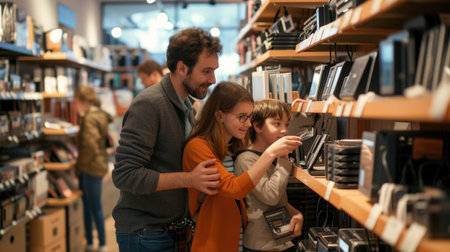 A family is exploring books at a library, having fun and browsing through various genres. They discuss different patterns, travel, and art concepts. AIG41
