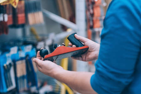 The buyer in the hardware store selects the goods. A man holds in his hand a planer for a tree