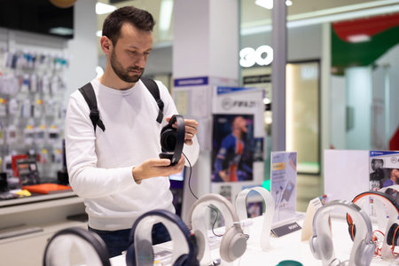 Minsk, Belarus - Nov 27, 2021: Photo of an adult handsome thinking brunet man with stubble in a white sweatshirt chooses headphones in an electronic store in a shopping mall. Shop and price concept