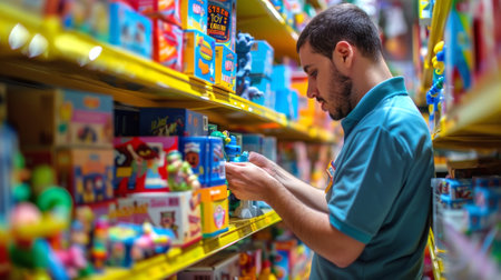 Latino man in a toy store examining a toy. Concept of shopping, retail, childhood, consumerism.