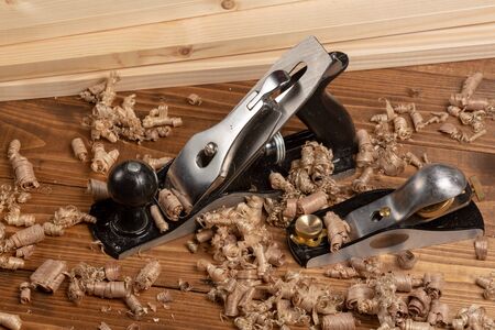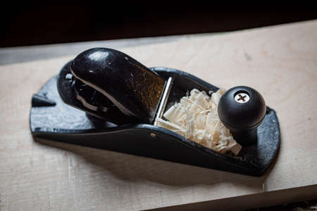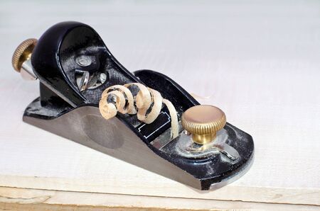 Metal planer with wood shavings. Carpenter cabinet maker hand tools on the workbench.