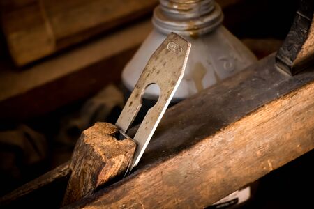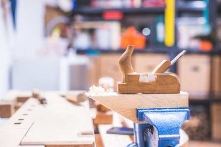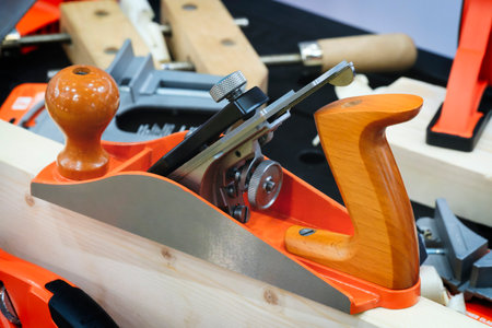 Carpenter's wood plane and other woodworking tools close up with foreground focus