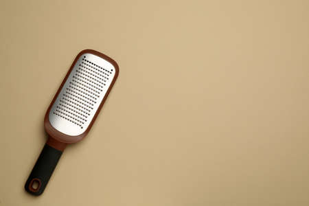 Close up on hand of unknown caucasian man holding electric beard trimmer cordless hair cutter in front of modern yellow background