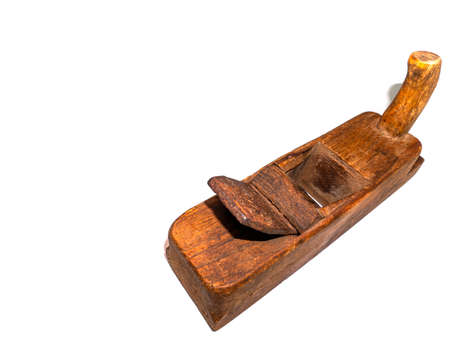 Carpentry tool wooden plane on a white background. Craftsman. Carpenter profession. Wood processing. Working tool of the plane. Background image. Place for your text. Handmade.