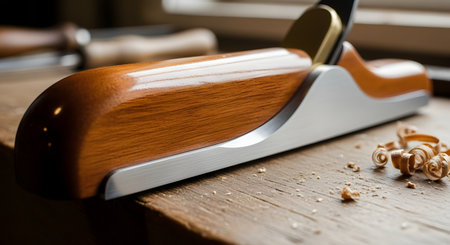 A beautifully crafted, modern block plane with a polished wooden body and brass accents rests on a woodworking bench next to delicate wood shavings. The elegant hand tool is shown in a close-up, highlighting the precision and quality of fine woodworking equipment. This image is a celebration of craftsmanship, carpentry, and traditional skills.
