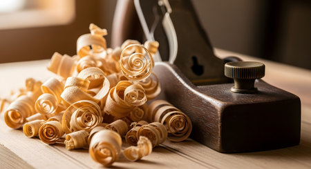 A close-up view of curled wood shavings piled next to a traditional hand plane on a wooden workbench. This composition illustrates the art of carpentry, woodworking, and the detailed process of smoothing timber.