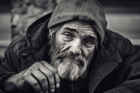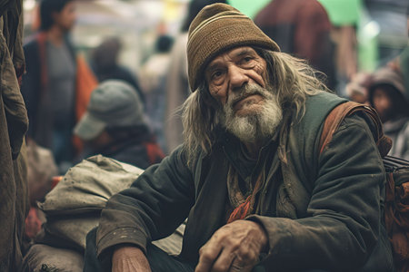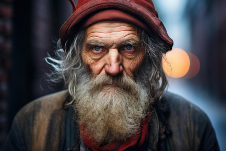 Closeup portrait of a rugged weathered elderly homeless man with a long beard and unkempt appearance standing on a city street and facing challenges of poverty and hardship