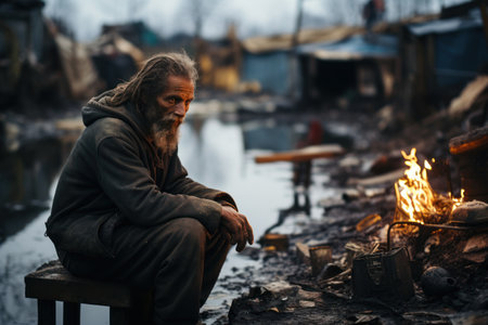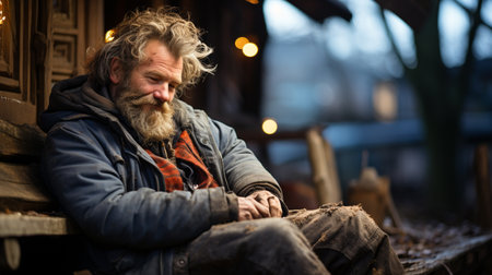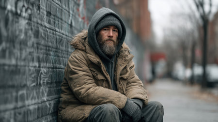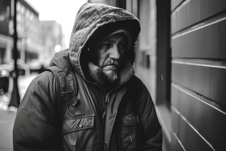 A contemplative moment captured on a cold day featuring a homeless man in a city environment, showcasing resilience and the reality of urban life challenges.
