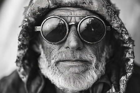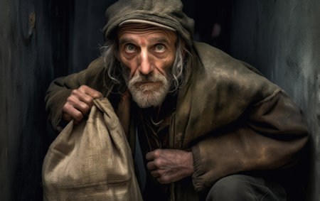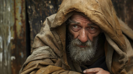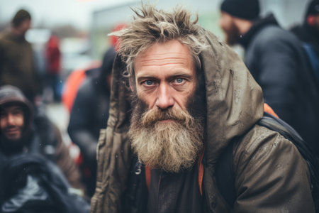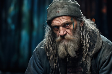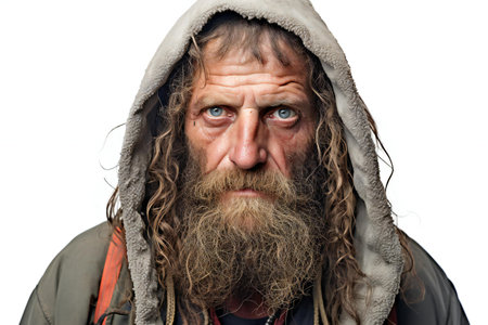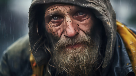 portrait of a homeless man with a long beard and mustache in a raincoat