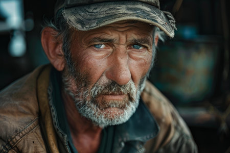 Close-up portrait of a weathered man in protective gear, with deep expression and gritty textures of labor and resilience.