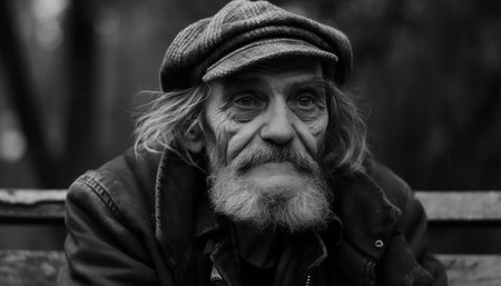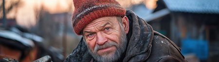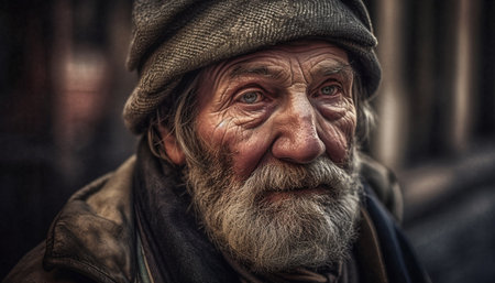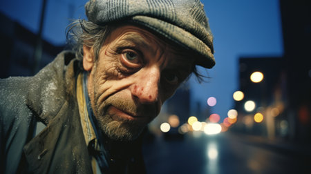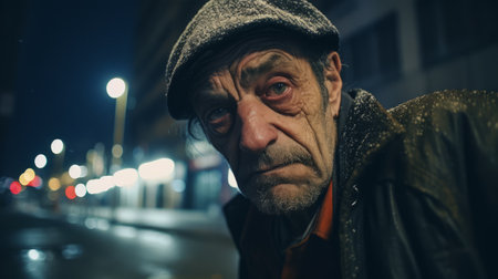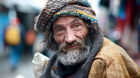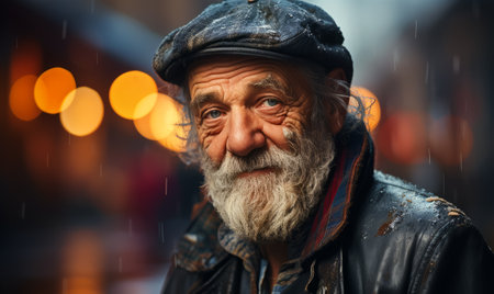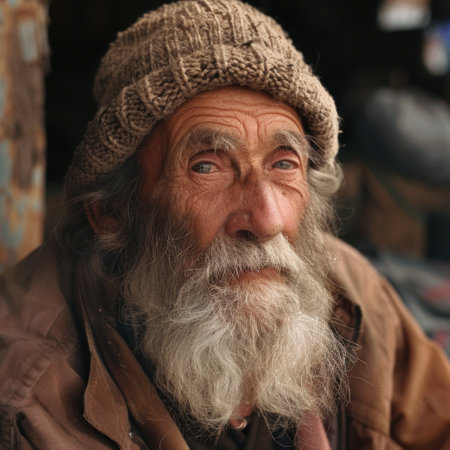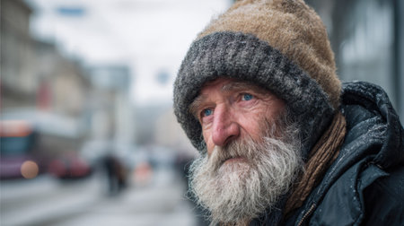 Portrait of an elderly man with a gray beard, wearing a knit hat and scarf in winter. Reflects hardship and resilience, with a backdrop of blurred city lights.