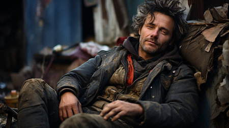 portrait of an unrecognizable homeless man sitting outside, created with generative ai