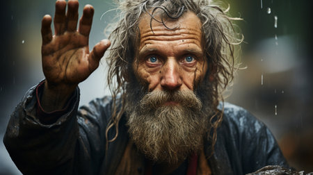 A homeless poor old man raised his hand in the rain
