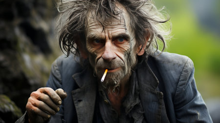 a poor homeless man with dirty hands smokes a cigarette in modern society. Economic recession, unemployment, poverty, hunger, pension, global crisis, the concept of the problem of inequality.