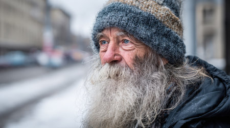 An elderly man with a long gray beard and a knitted winter hat stands on a snowy street. He gazes thoughtfully at passerby surrounded by urban buildings on a chilly day.