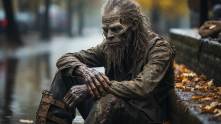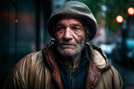 old homeless man in the street on a rainy day. generated by AI