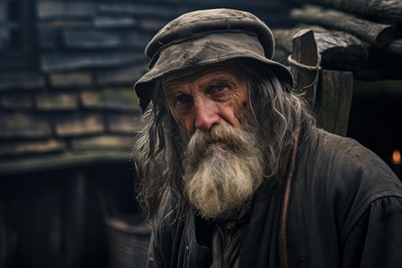 Portrait of an elderly man with a contemplative gaze and rustic attire