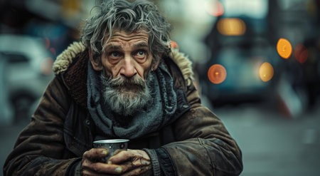 An older man with a gray beard and a weathered face holds a metal cup in his hands. He is wearing a heavy jacket and a scarf, and he is standing on a busy city street.