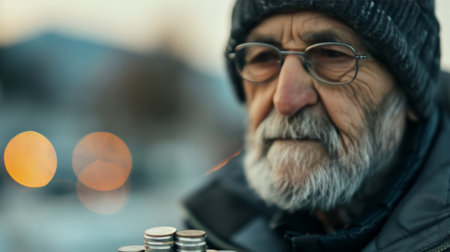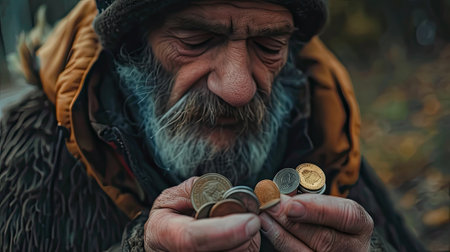 Closeup of a homeless man holding coins outdoors, evoking empathy and highlighting the harsh realities of poverty and social inequality. Ideal for charity campaigns and social advocacy.