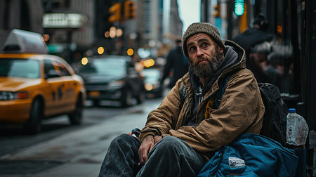 Homeless man sitting on city street in New York during early evening hours