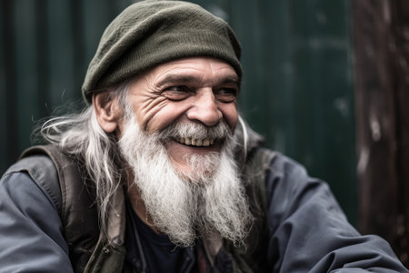 portrait of a smiling homeless man sitting outside, created with generative ai