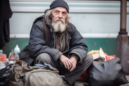 homeless man sitting on the street with his belongings, created with generative ai