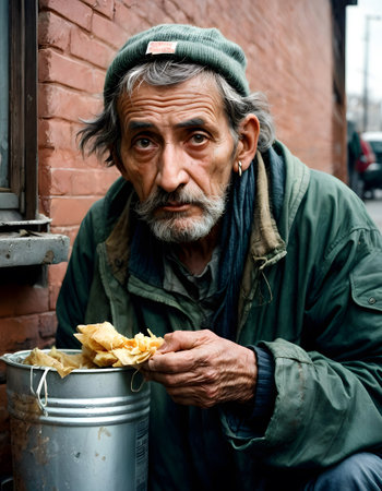 A solitary man sits by the wall, finding sustenance in a simple meal, his face etched with the wisdom and wear of life. His eyes, filled with a quiet resilience, reflect the reality of survival on the streets.