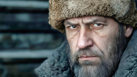 The man gazes intensely, his beard and fur-lined hat capturing the harshness of winter, echoing stories of strength and survival from the Soviet era.