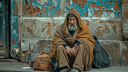 A portrait of homeless beggar man sitting outdoors.
